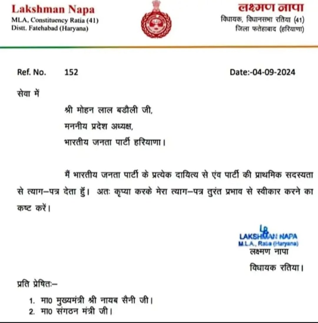 Just a day after the BJP released its first list of candidates, Lakshman Napa, the MLA from Ratia, resigned from the party’s primary membership. This was following the exclusion of his name from the first list of 67 candidates who would be contesting in the upcoming Haryana Assembly elections. The Haryana Assembly elections are scheduled for October 5. Shortly after the list was released, Napa wrote a letter to state party chief Mohan Lal Badoli, expressing his decision to leave the party. In another development in the BJP, the party has decided to address anti-incumbency by introducing new faces for six out of seven assembly seats in the Rohtak and Jhajjar districts. Manish Grover, a senior BJP leader and former minister closely associated with former CM Manohar Lal Khattar, is a leading contender for the Rohtak ticket.