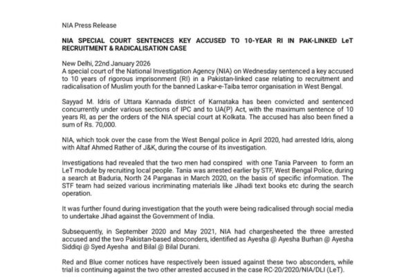 The North News New Delhi, January 22 A special NIA court has sentenced a person to 10 years of rigorous imprisonment for being involved in…